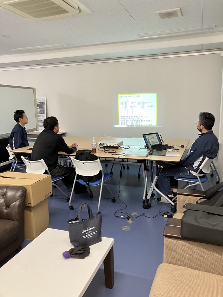 こんにちは!マルニ運輸です!本日は4月1日に入社された2名が座学2日目を受けています。